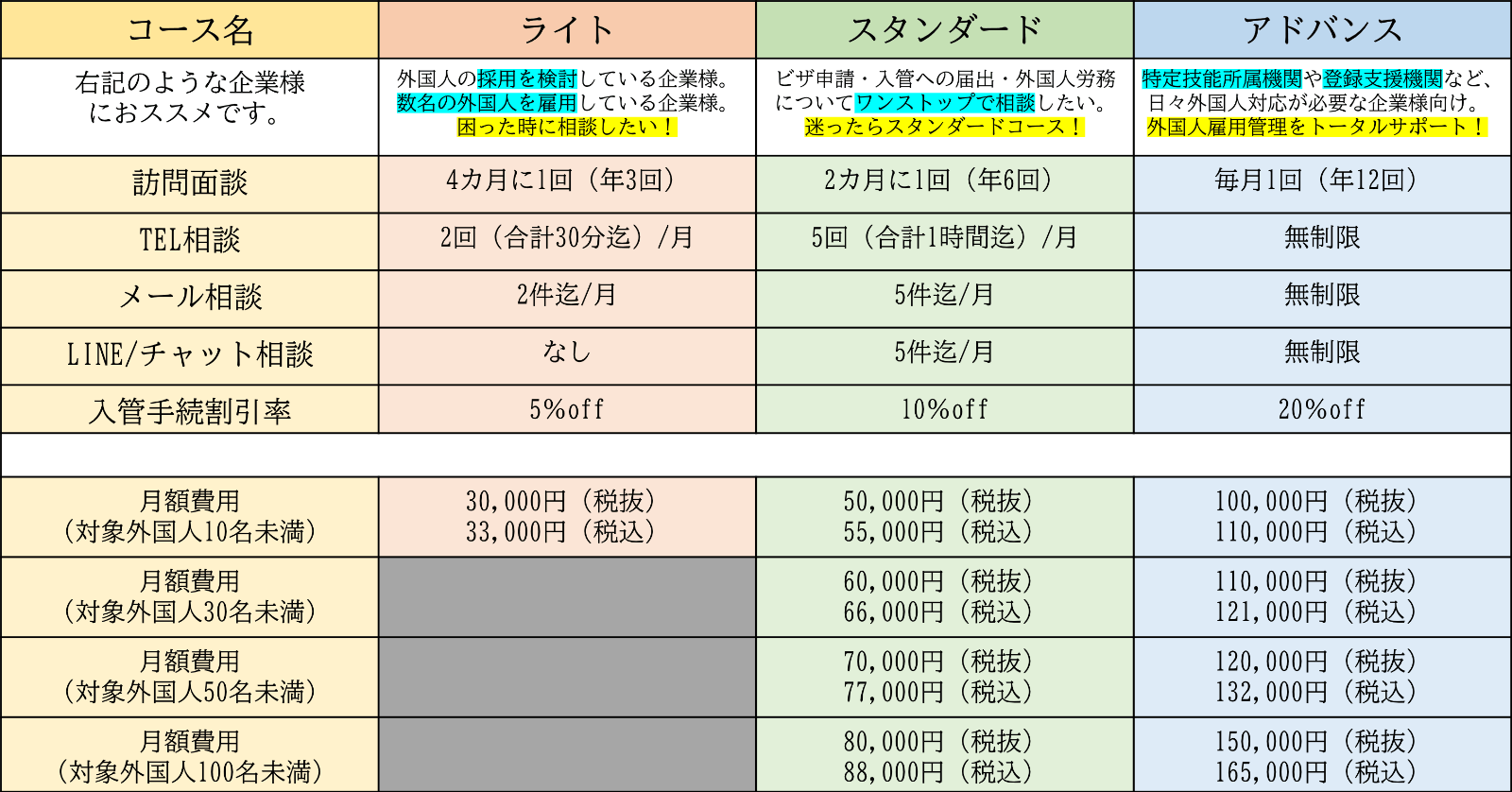 【外国人雇用アドバイザリー契約 料金表】